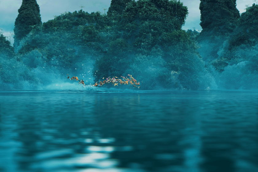 Nous avons utilisé Houdini et Cinema 4D pour créer les simulations fluides du projet, allant d'effets à grande échelle, comme l'impact du dragon sur le lac, aux détails plus fins comme lorsque le produit jaillit hors de l'eau.