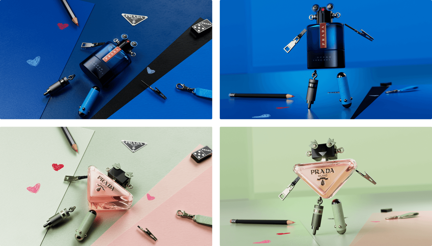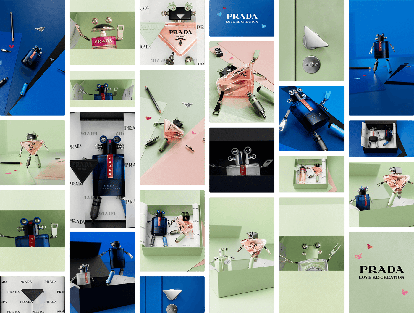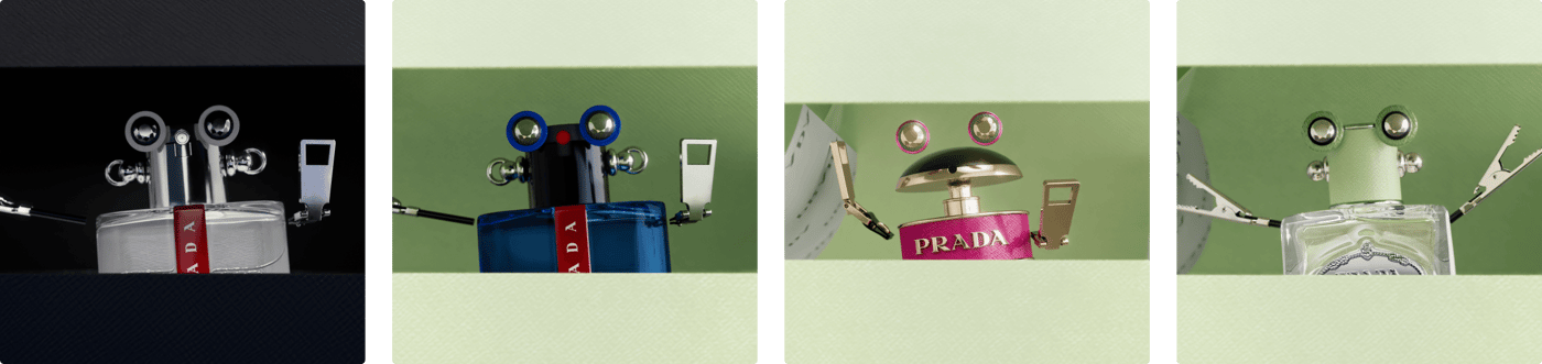 Pour la campagne Prada Fête des mères 2023, nos amis de l'agence Seiya sont venus vers nous avec une belle idée : transformer les parfums emblématiques de Prada en charmants robots.