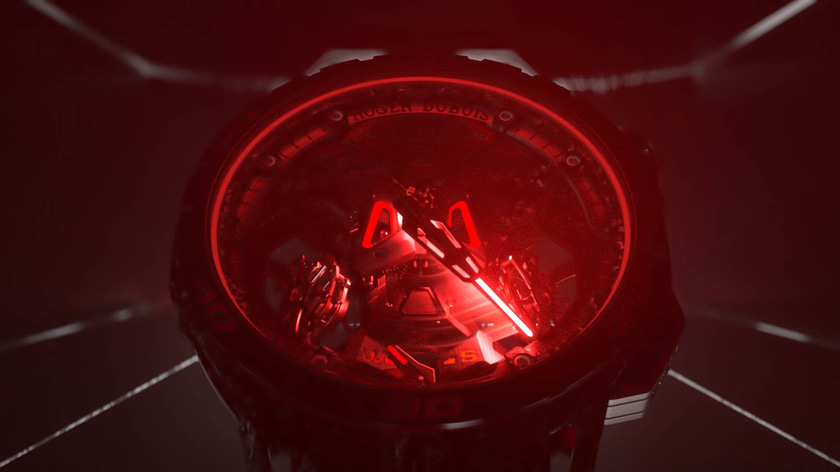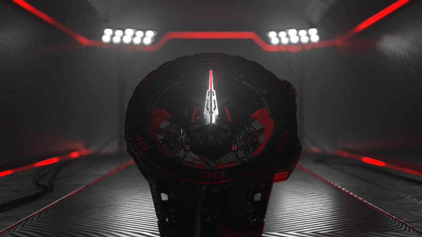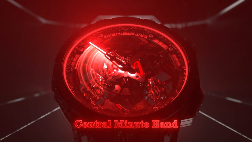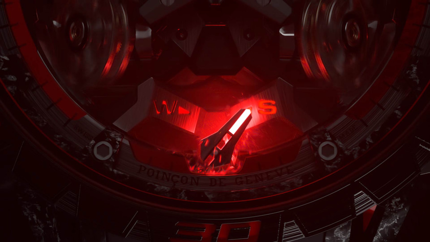 Nous avons créé des effets de lumière 3D pour révéler les différents mécanismes de la montre, et animé l'unique aiguille comme un compteur de vitesse.