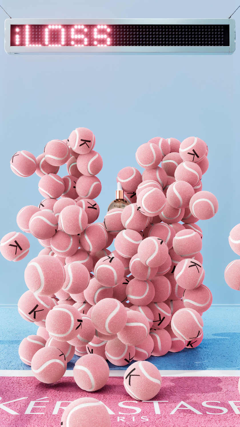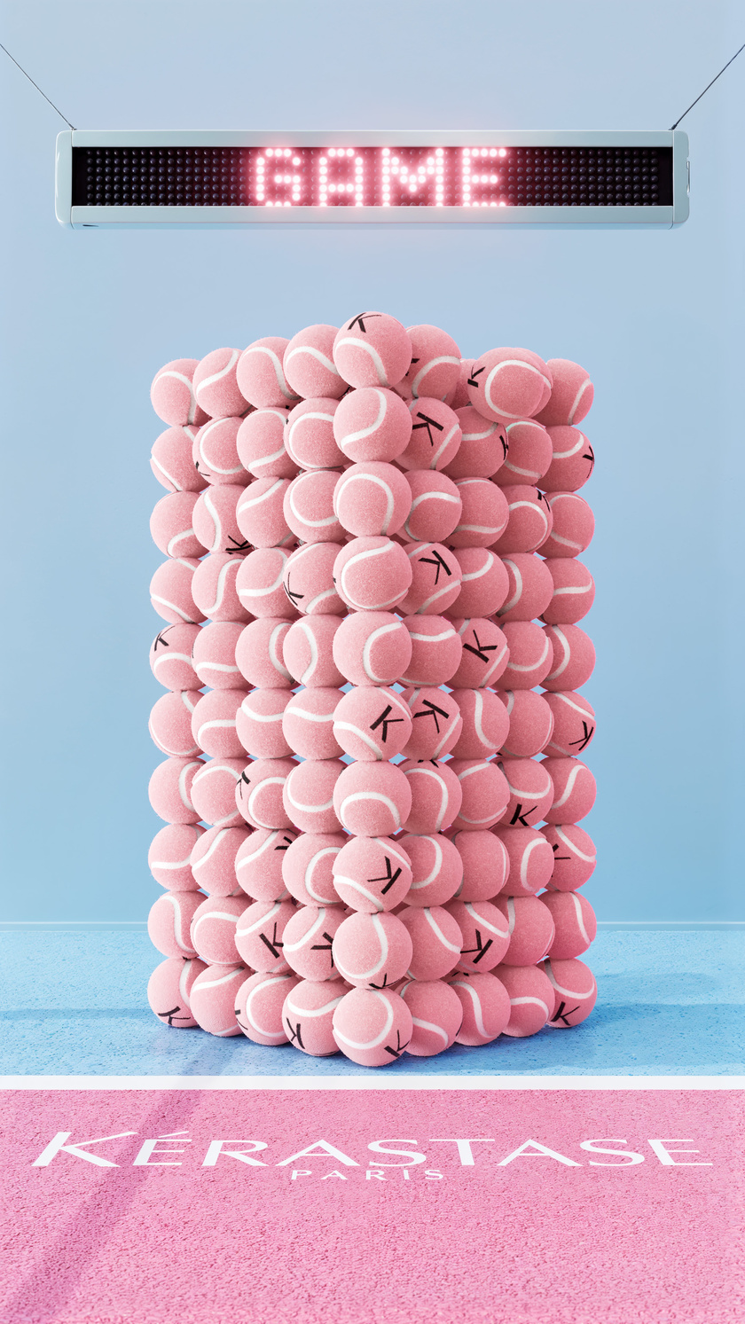 At the heart of the concept is a custom-designed tennis ball, rendered in 3D with fluffy fabric textures and an engraved Kérastase “K” logo.