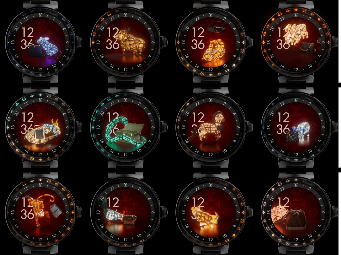 For the fourth year in a row, we had the pleasure of collaborating with Louis Vuitton to create a stunning collection of 12 watchface animations for their 2023 Chinese New Year collection. After using the animal designs we created in 2020 for three years, the client wanted to explore a new style. They were inspired by the animal-shaped Chinese lanterns used in festivals, and challenged us to create 12 new animal designs that would reflect this style.