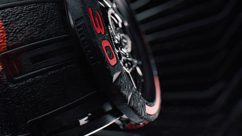 We created fully procedural 3D materials using Arnold Renderer advanced shading capabilities. This allowed us to get a very detailed and realistic used rubber material even with very close-up shots.